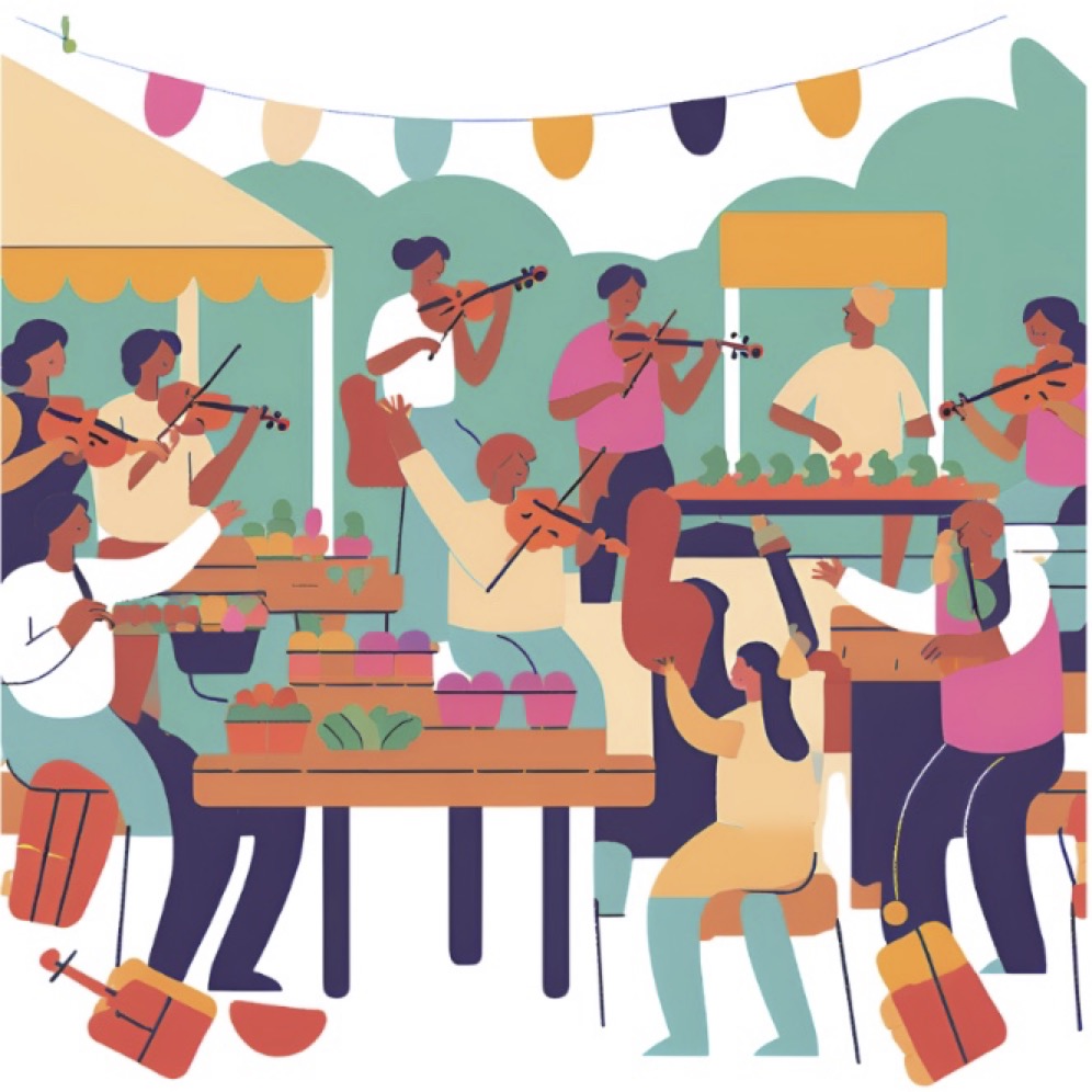 Faire découvrir au grand public les musiques de violon traditionnel d'Occitanie est la mission essentielle que s'est donnée l'association 12 Violoneux. Et pour cela, un marché est un lieu tout à fait adapté ! Sur notre stand, véritable "juke-box trad", les habitués du marché ou les touristes pourront choisir parmi notre vaste répertoire un morceau traditionnel que nous nous empresserons de leur jouer et sur lequel ils pourront même danser !